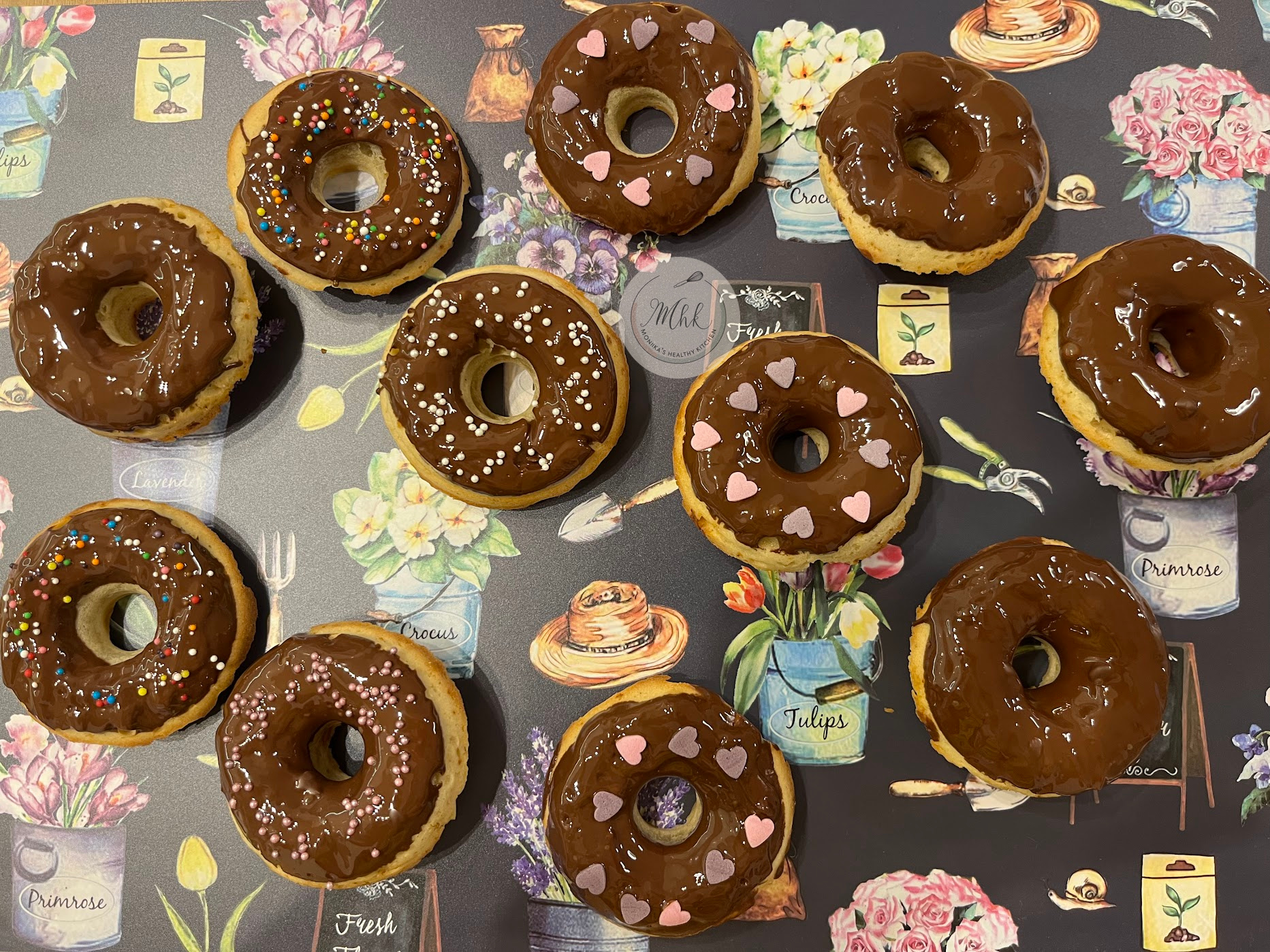 - Глазурата: Разтопете на водна баня шоколада, сложете 1 с. л. кокосово масло. Потопете охладените понички в шоколада, украсете и оставете да се втвърди за 30 минути на стайна температура.