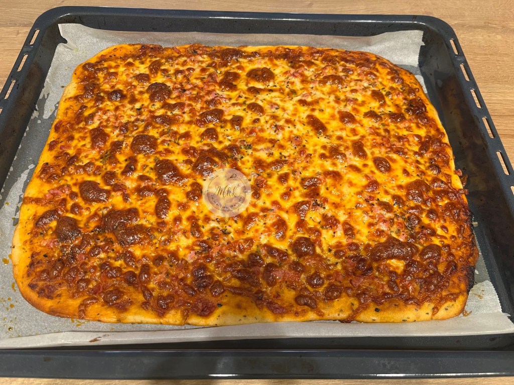 - Печете пицата в предварително загрята на 190 °C фурна. Печете до готовност – около 20 минути.