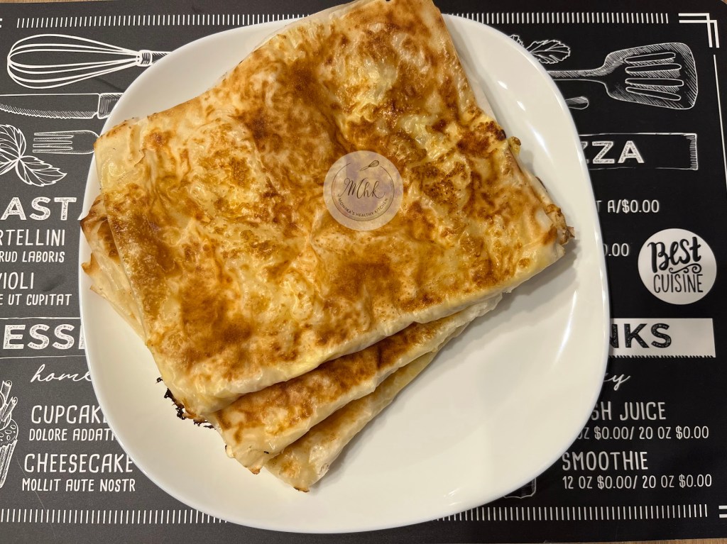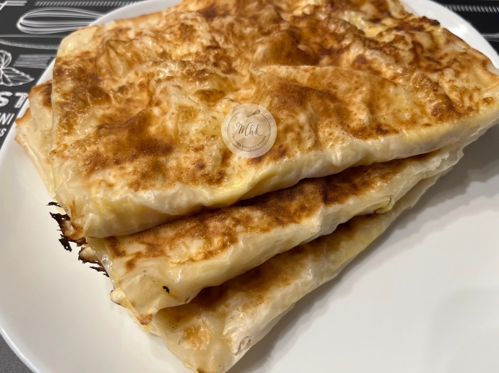 - Вземете една кора – намажете (напръскайте) със смесеното масло и олио. Сложете втора кора върху първата – отново накапете с мазнина. Сложете равномерно от плънката и прегънете на половина. Намажете отново с плънката – прегънете на половина. Намажете с мазнина и сложете я предварително нагорещен тиган 6 от степен 9. Намажете отгоре с мазнина и след 3-4 минути обърнете баничката да се запече и от другата страна.