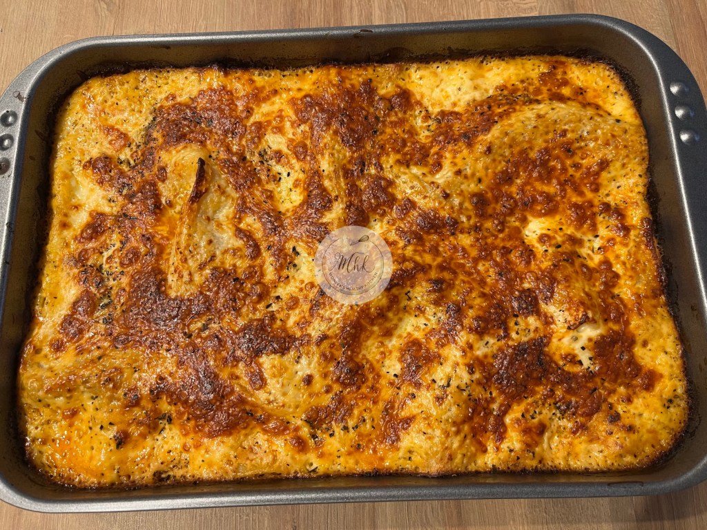 - Поръсвате отгоре с настъргания кашкавал, покривате тавичката с фолио и печете в предварително загрята фурна на 220 °C за около 30 минути.