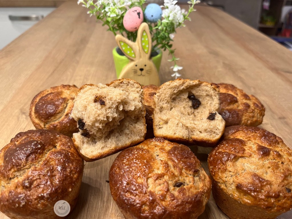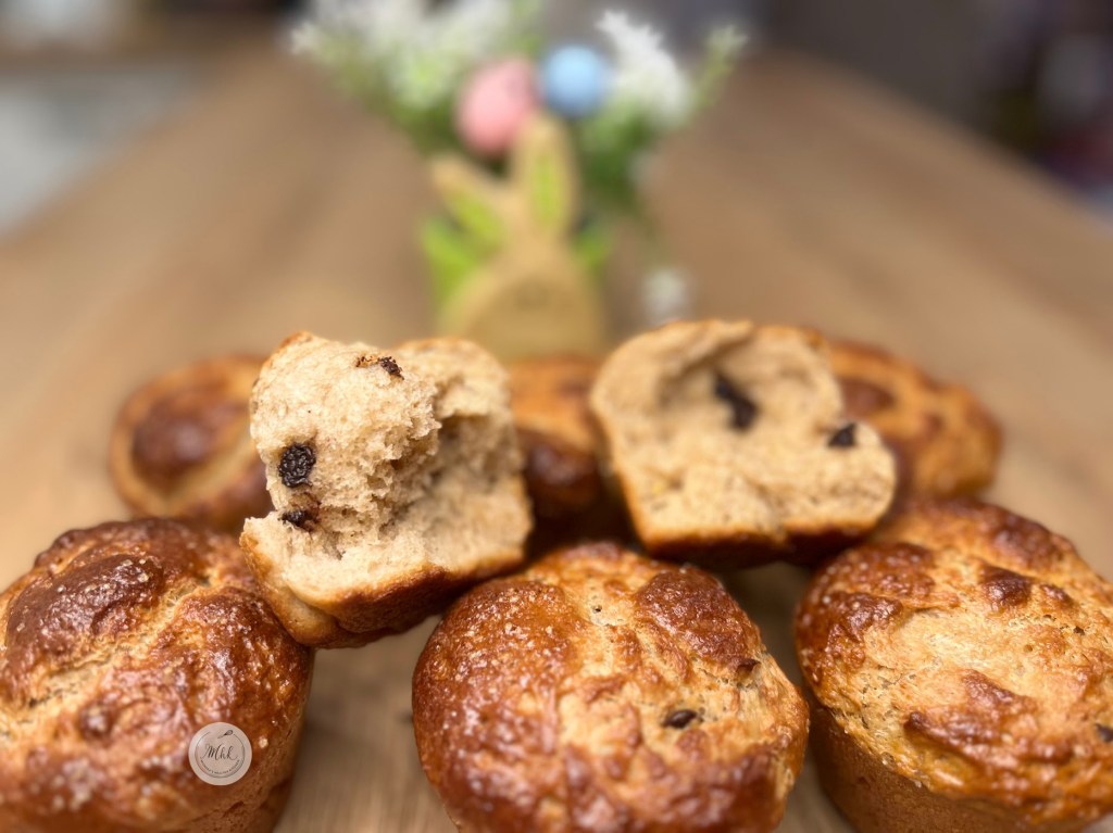 - След като втаса, премесете леко тестото и го разделете на 11 равни части (около 80–85 г всяка). От всяка оформете правоъгълник, поръсете с шоколадови капки или плънка по избор, навийте и оформете фитил. Усучете и поставете в намаслени форми за мъфини.